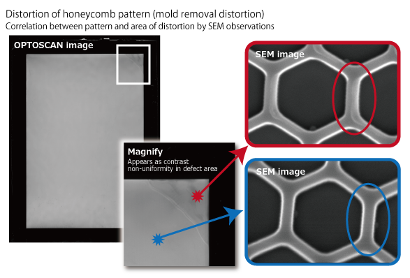 | Primary Applications: | ●Features・・・using telocentric optics, micron order level pattern non-uniformity, micro-scratches, particles, resin non-uniformity can all be confirmed with high-speed |