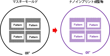 微細な凹凸構造をもった金型を用いて、それを様々な基板(Si、ガラス、樹脂、各種化合物半導体など)上に塗布した樹脂に押しつけてパターン転写をする、いわゆるスタンピングの技術になります。