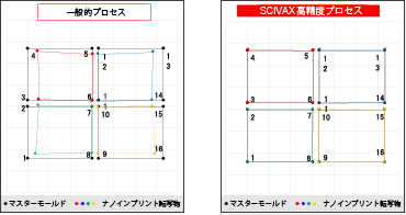 ナノインプリントは、半導体露光技術で加工した基板を金型として用いることが可能ですので、半導体プロセスと同等のナノレベルの微細加工を、一括で形成(コピー)することができる安価な量産プロセス技術ということができます。