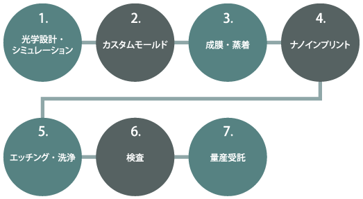 ナノインプリント技術のみでは、量産を実現することは出来ません。当社では、実用化に必要となる周辺技術との融合を進め、独自の超微細加工ファウンドリプラットフォームを構築しました。本ファウンドリサービスをご活用いただくことにより新製品の開発期間を大幅に短縮することが可能になります。