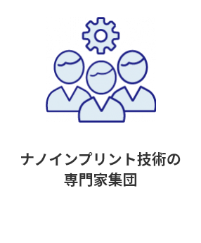 微細な凹凸構造をもった金型を用いて、それを様々な基板(Si、ガラス、樹脂、各種化合物半導体など)上に塗布した樹脂に押しつけてパターン転写をする、いわゆるスタンピングの技術になります。